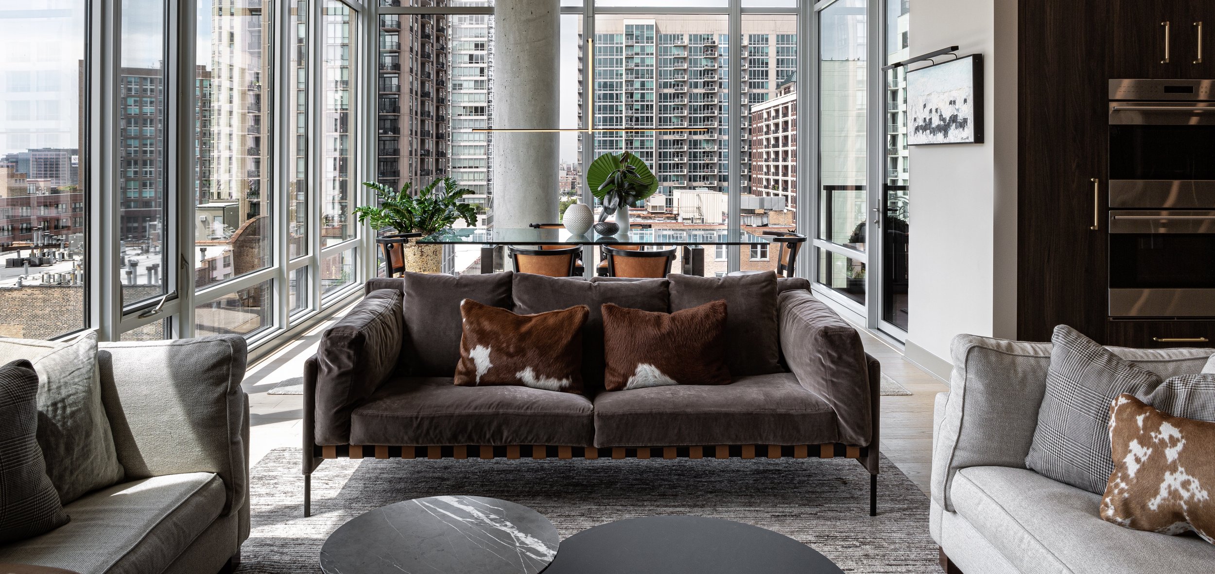 Longtime friends of the NMI team, these sophisticated empty nesters sought to craft a chic downtown sanctuary after years of suburban living in Evanston. Entrusting NMI with their vision, we collaborated closely with the development team of this new-build condo project to oversee every detail of the interior design, from curated finish selections to strategic reconfigurations of the home’s interior architecture. Key transformations included converting a full bath into an elegant powder room and reimagining a closed-off study as a dynamic dry bar that seamlessly bridges the public living areas with the private bedrooms and study. To elevate the ambiance further, we redesigned the electrical plan, integrating task-specific and art-focused lighting to beautifully showcase the clients’ remarkable art collection which includes originals by Alexander Calder, Joan Mitchell and Robert Motherwell (to name a few). The result is a sophisticated urban retreat that reflects their refined tastes and lifestyle.